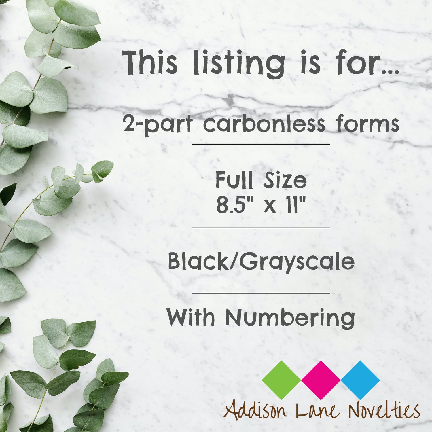 Need more options? Check out our other listings for additional sizes, color options, and numbering choices. Trust us to provide you with professional and personalized custom carbonless forms for your business needs.